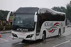 Acklams Coaches operates a wide variety of coaches for a range of work, including shorter school services, sports team coaches and multi-day excursions across continental Europe. A large amount of the coaching fleet consists of Plaxton-bodied coaches on Volvo chassis, including three "interdeck" Plaxton Elite is,[11] a number of conventional Elites and a Plaxton Panorama.[12][13][14] Most Acklams coaches are painted white, however some from the 'Elite Travel' executive fleet are painted black with silver fleetnames, the name originating from the Plaxton coach.[12]