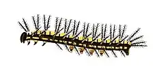 - Larva whitish yellow with two black longitudinal lines on each side; head and spines black. Pupa whitish with very fine black markings. Senegal to Angola, Nyassaland and Uganda.