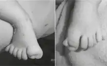 Acrocallosal syndrome (ACLS, ACS, Schinzel-type, Hallux-duplication) is a rare, heterogeneous[5] autosomal recessive disorder first discovered by Albert Schinzel (1979) in a 3-year-old boy.[4] Characteristics of this syndrome include agenesis of the corpus callosum, macrocephaly, hypertelorism, poor motor skills, intellectual disability, extra fingers and toes (particularly hallux duplication), and cleft palate. Seizures may also occur.[2]