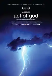 Act of God is a 2009 Canadian documentary film that investigates the "metaphysical" effects of being struck by lightning.[1] It was directed by Jennifer Baichwal (Manufactured Landscapes) and distributed by Zeitgeist Films.[2] The film's world premier was at the 2009 Hot Docs Canadian International Documentary Festival at the Royal Ontario Museum in Toronto on 30 April 2009.[3] It went on general release in Canada on 1 May 2009, and limited release in the United States on 31 July 2009. The film's European premiere was at the 44th Karlovy Vary International Film Festival in the Czech Republic on 11 July 2009.[4]