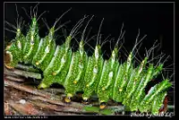 The female lays up to 120 eggs, and may place their eggs anywhere. The egg is oval-shaped, 1.5 by 1 millimetre (0.059 in × 0.039 in); whitish gray, and firmly stuck to branches or sides of the cage that the female had been kept in. Caterpillars, 4–5 millimetres (0.16–0.20 in) long, hatch after 10–14 days, the warmer and the higher the humidity, the quicker it happens.