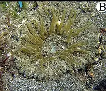 The foot of the column is usually attached to a hard substrate, a rock, a shell or a sea grass rhizome, while the oral disc lies flat on the sediment surface. During the day, the tentacles are contracted and the collar expands so that the zooxanthellae receive the maximum amount of sunlight for photosynthesis; the greenish-brown colour of the collar resembles scraps of dead seagrass and may provide camouflage. At night, the tentacles are extended to catch plankton and organic particles, and the collar contracts.[3] At the slightest disturbance, the whole column contracts and the sea anemone disappears beneath the sediment. It has been found that two types of faecal pellets are emitted through the mouth; one type contains the normal end-products of digestion, but the other contains zooxanthellae debris covered with mucus, which continue to be produced even when the animal is starved of planktonic food. This suggests that the mainstay of the sea anemone's diet may be the digestion of the zooxanthellae found in its tissues.[2]