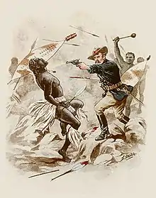 The men of the NNC with rifles opened fire, causing the company under Hamilton-Browne at the foot of the cliffs, who were also under fire from the Zulus, to take cover.[31] Black once more tried to lead the NNC in an attack; waving his hat over his head in one hand and brandishing his sword in the other.[4] Black's hat was shot out of his hand and he was struck "below the belt" by a boulder thrown from the cliffs, causing pain but no injury and halting his advance.[31]