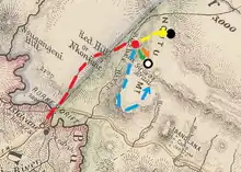 Chelmsford and Glyn determined to clear the Zulu from the gorge before proceeding to the kraal to burn it.[25] Chelmsford ordered Russell's mounted infantry to move to the south where the slope was climbable and to sweep around behind the Zulus on the heights to threaten them and cut off any retreat.[4][23] In the meantime the entire 1st battalion of the 3rd regiment of the Natal Native Contingent (under Commandant George Hamilton-Browne) were to assault the Zulus on the lower ground and attempt to seize the cattle, they would be supported by three companies of the 1st battalion of the 24th Regiment (commanded by Captain William Degacher).[4][26] The 2nd battalion of the 3rd regiment of the Natal Native Contingent (commanded by Commandant Edward Russell Cooper) and additional men from the 24th Regiment of Foot, including four companies of the 2nd battalion, were held in reserve.[4][27][25]