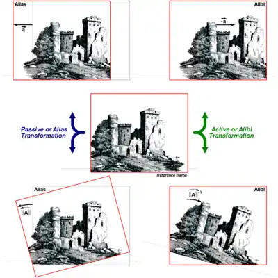 Geometric transformations can be distinguished into two types: active or alibi transformations which change the physical position of a set of points relative to a fixed frame of reference or coordinate system (alibi meaning "being somewhere else at the same time"); and passive or alias transformations which leave points fixed but change the frame of reference or coordinate system relative to which they are described (alias meaning "going under a different name").[1][2] By transformation, mathematicians usually refer to active transformations, while physicists and engineers could mean either.