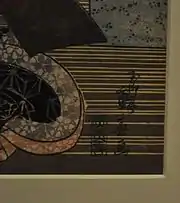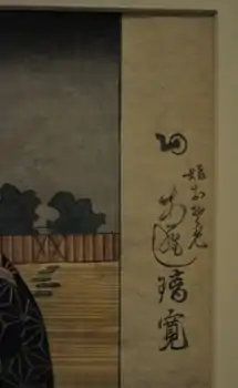 In this print, Rikan II is depicted as Osome, heroine of Somemoyō Imose no Kadomatsu (染模様妹背門松) (The Love of Osome and Hisamatsu). Originally written for the bunraku (文楽) puppet theatre, it was adapted for the kabuki stage in 1782.[18] It is one of several dramas recounting the tragic true story of two star-crossed lovers who committed double-suicide in 1710, one the daughter of a merchant, the other, her father's apprentice.[19] Osome was a popular subject for yakusha-e artists and often depicted wearing a kimono decorated with hemp flowers.[20]