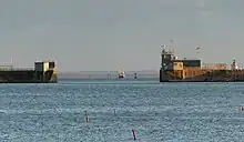 Beginning in 1958, the New Bedford Harbor Hurricane Barrier was built from a point about 300 feet north of Fort Phoenix, in Fairhaven, to Gifford Street on the New Bedford coast. The 20-foot high barrier continues onto land, where three large doors allow street traffic to pass through during calm seas.[2] The longer segment continues along the New Bedford coast to just before Frederick Street. A discontiguous segment protects the top of Clark's Cove in New Bedford, roughly to the Dartmouth border.