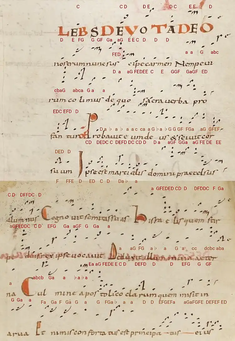As an apostle, Saint Martial would be entitled to a substantial mass for the celebration of his feast day within a festal octave. Adémar therefore composed a series of hymns, providing both text and music due to his position as cantor at Saint Martial. This he did by troping, i.e. adding additional text to a number of pre-existing hymns and sequences, also providing proper mass chant for Saint Martial as apostle and patron of the Monastery.[16] Following the libellum structure of the manuscript, the elements of the mass are not presented continuously, since the alleluia verses preceding the Gospel and offertories of the Mass were separated as "little books" (libelli), while the sequences are written in a third one.