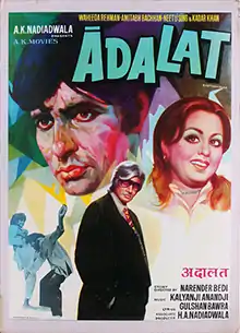 Adalat (transl.Court) is a 1976 Indian Hindi-language action drama film directed by Narendra Bedi.[2] The film stars Amitabh Bachchan in a double role as both father & Son and he received a Filmfare nomination as the Best Actor, the only one for the film.[3] Waheeda Rehman and Neetu Singh play his love interests. The music is by Kalyanji Anandji. The film was a blockbuster at the box office.