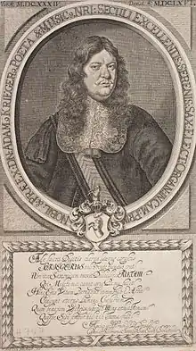 Adam Krieger (7 January 1634 – 30 June 1666) was a German composer. Born in Driesen, Neumark, he studied organ with Samuel Scheidt in Halle. He succeeded Johann Rosenmüller as organist at Leipzig's Nikolaikirche (1655–57) and founded the city's Collegium Musicum before settling for the rest of his career as court organist in Dresden.[1]