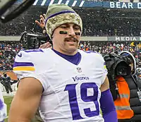 Thielen made his NFL debut in the season opener in a road game against the St. Louis Rams on September 7.[16] In Week 5, he caught his first NFL pass in the Vikings' 42-10 road loss against the Green Bay Packers, finishing the game with four receptions for 57 yards that led the team in receiving.[17] He was named NFC Special Teams Player of Week 13 after he scored his first NFL touchdown on a special teams play in which he blocked Carolina Panthers' punter Brad Nortman's kick and returned the ball 30 yards to the end zone.[18] Thielen briefly held the record for the longest blocked punt returned for a touchdown in franchise history, but was beaten later in the second quarter with a 43-yarder from Everson Griffen as the Vikings had two blocked punts returned for touchdowns in the game.[19] In Week 17 against the Chicago Bears, Thielen scored his first receiving touchdown on a 44-yard pass from quarterback Teddy Bridgewater, after which he promptly gave the ball to his wife (then fiancée) Caitlin.[20][21]