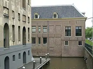 On its façade is the Hollandic Lion, holding the coat of arms of the High College and guarding the Hollandic Yard, the symbol of territorial integrity and security. On the site of the new 1924 development stood a number of fine houses built by Philips Vingboons, previously used by high officials of the Admiralty.[4] The vroedschap commissioned the great poet Vondel to write verses to be recited at the inauguration of the building. To adorn the interior, Ferdinand Bol was commissioned to paint four huge allegorical paintings, for which he was paid 2,000 guilders.[5]