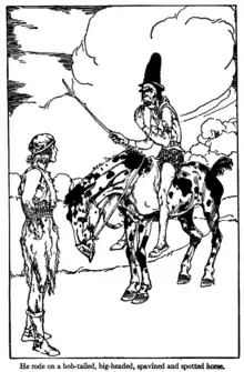 ![]() Gilla Na Chreck An Gour (The Fellow in the Goatskin) meets a man on the road. Illustration by Willy Pogány (1916). | |