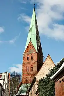 The St.-Aegidien-Kirche or Aegidienkirche is a church building in the north German city of Lübeck, dedicated to saint Giles. It is the smallest and easternmost church in the city centre. It is first mentioned as dedicated to St Giles in 1227 - this is unusual for a north German and may link it to an earlier 1172-1182 wooden church built under bishop Henry I, formerly the abbot of the abbey dedicated to the same saint in Braunschweig. The church's coat of arms includes a "T", short for "Tilgenkark", the Low German form of the church's name, and "St Tilgen" or "St. Illigen", the Low German forms of the saint's name.