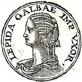 When Lepida lived, Agrippina the Younger (a widow after Gnaeus Domitius Ahenobarbus' death) tried to make shameless advances to Galba, who was devoted to his wife and thus completely uninterested. On one occasion Lepida's mother gave Agrippina the Younger, while in the company of a whole bevy of married women, a public reprimand and slapped her in the face.[5]
