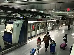 AeroTrain is a 3.78-mile (6.08 km) underground people mover system at Washington Dulles International Airport. It was scheduled to open in fall 2009,[2] but was delayed until 2010 in order to complete reliability tests.[3] It opened to Dulles employees on January 20, 2010, and to passengers January 26, 2010.[4] The system mostly[2] replaced the mobile lounges that transport passengers from the concourses to the Main Terminal. The system cost about $1.4 billion and also includes a new security screening mezzanine. The system utilizes 29 Mitsubishi Heavy Industries Crystal Mover vehicles as its rolling stock.