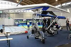 A number of different wings can be fitted to the basic carriage, including the basic Aeros Discus T, a version of the Discus hang glider wing for nanotrikes, that comes in two sizes, Discus 14T and 15T. The Fox T wing is a slow and maneuverable wing that can also be fitted. Higher performance can be obtained with the Combat T wing, a topless hang glider wing adapted for nanotrikes.[1][3]