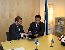 Estonian Ambassador to the United Nations Margus Kolga (left) signs diplomatic relations with the Tuvaluan Ambassador to the United Nations, Afelee F. Pita (right). 25 May 2011.
