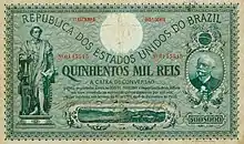 Discussions in Congress began on 19 July 1906 and the agreement was approved with a large majority on 6 August 1906, becoming Decree No. 1,489.[73][74] Contrary to his predecessor, Afonso Pena – then president-elect – was in favor of the Caixa de Conversão, as he deemed it "essential to the balance of public finances".[75] The bill for its creation was then approved in Congress on 6 December 1906 and signed by Pena, already sworn in office.[76][77] The Caixa de Conversão would receive deposits of legal tender gold coins and in return issue bills of equal value to the depositors; the exchange rate would also be fixed at 15 pence to 1 thousand réis. Thus, Brazil effectively adopted the gold standard.[77][78]