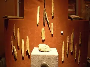 Afontova Gora is a complex, consisting of multiple stratigraphic layers, of five or more campsites.[2] The campsites shows evidence of mammoth hunting and were likely the result of an eastward expansion of mammoth hunters.[3] The human fossils discovered at Afontova Gora, a male and a girl dated to 17,000~15,000 years BP, were stored in the Hermitage Museum.[2]
