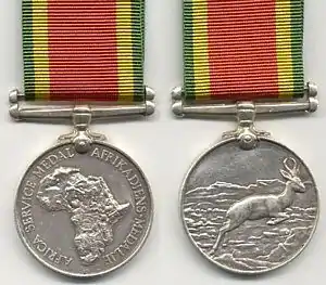 The Africa Service Medal was awarded to members of the Union Defence Forces, the South African Police and the South African Railways Police.[2][3][4]