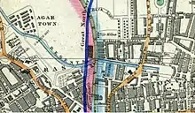 The area was named after William Agar, a wealthy lawyer who lived at Elm Lodge, a villa in large grounds near to the Regent's Canal roughly where Barker Drive stands. Key streets were Canterbury Place, Durham Street, and one of the city's Oxford Crescents.[1] The area contained low-quality housing for the poor and labourers building the houses, made of the lowest quality materials on 21-year leases, with no street lighting, cleaning or sewerage. Consequently, Agar Town was generally considered a slum.[1] This designation has been questioned.[2]