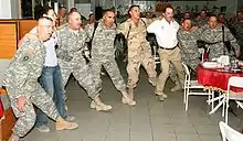 A group of Aggie soldiers in Camp Victory, Iraq doing the "Saw Varsity's Horns Off" portion of the war hymn
