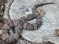 The western cottonmouth (Agkistrodon piscivorus leucostoma)[2][3][4] was once classified as a subspecies of the cottonmouth (Agkistrodon piscivorus). However, DNA based studies published in 2008 and 2015, revealed no significant genetic difference between the eastern cottonmouth (Agkistrodon piscivorus piscivorus) and the western cottonmouth (Agkistrodon piscivorus leucostoma) and synonymized the two subspecies (with the oldest published name, A. p. piscivorus, having priority). The resulting taxonomy does not recognizes the western cottonmouth (A. p. leucostoma) as a valid taxon.[5][6] Several subsequent reviews and species accounts have followed and supported the revised taxonomy.[7][8]: 437 p. [9] Information on this snake can be found in the Agkistrodon piscivorus article.
