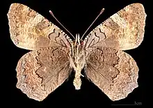 Hindwing basal two-thirds dusky brown, outwardly margined by a sinuous jet-black line; both forewings and hindwings with the transverse series of triangular dark marks of the upperside showing through.
