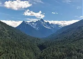 During the Pleistocene period dating back over two million years ago, glaciation advancing and retreating repeatedly scoured the landscape leaving deposits of rock debris.[4] The U-shaped cross section of the river valleys is a result of recent glaciation. Uplift and faulting in combination with glaciation have been the dominant processes which have created the tall peaks and deep valleys of the North Cascades area.