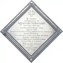 Agnes de Selincourt (1872–1917) was a Christian missionary in India, responsible for the founding of missions, becoming the first Principal of Lady Muir Memorial College, Allahabad, India and then Principal of Westfield College, London, UK from 1913 until her death in 1917.[1][2][3][4]
