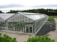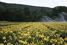 As of 2012, there were 7,755 farms in Massachusetts encompassing a total of 523,517 acres (2,120 km2), averaging 67.5 acres (27.3 hectares) apiece,[1] but by 2017 this had declined somewhat again, to 7,241 farms in the state.[2] Greenhouse, floriculture, and sod products – including the ornamental market – make up more than one third of the state's agricultural output.[2][3] Cranberries, sweet corn and apples are also large sectors of production.[3] Massachusetts is the second-largest cranberry-producing (Vaccinium macrocarpon) state in the union after Wisconsin.[4] Agriculture in the state is served and represented by the Department of Agricultural Resources (MDAR).