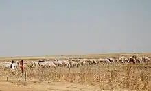 Sheep are herded chiefly by transhumants in Darfur and Kordofan.[16] Large numbers are found in the drier areas at greater elevations than the usual cattle zone.[16] There were several breeds but the predominant and preferred one is the so-called desert sheep, which has both good weight and good milk yield.[16] Villagers in Al-Gedaref and Sinnar also raise large numbers of sheep, mostly on a nonmigratory basis. Fodder comes from crop residues on irrigated and rain-fed farms and from vegetation along the rivers and canals.[16]