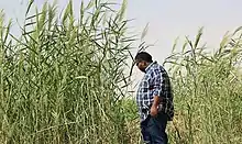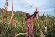 Sorghum is the Sudanese staple food crop, but the yield varies, depending on weather conditions and the amount of irrigated land used for it.[7] Production is also cyclical; when there are large surpluses of the grain, prices fall, discouraging production in the subsequent year.[7] Output reached a high of nearly 5.2 million tonnes in 2003 but declined to 3.9 million tonnes in 2008 and to an estimated 2.6 million tonnes in 2010 as production continued to drop.[7] In 2018, Sudan produced 4.9 million tons of sorghum, making it the world's third-largest producer.[8] Exports in 2010 realized an estimated US$200,000.[7]