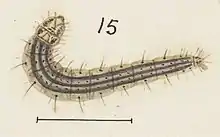 The larva is about 1⁄2 inch in length, rather stout, tapering at each end. The head is brown with three broad darker brown bands; the second segment is pale brown and horny; the rest of the body creamy white with three dark brown dorsal stripe; each segment has eight dark brownish or black warts generally surmounted by a fine yellowish bristle.[6]