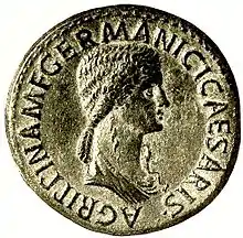 She was a prominent member of the Julio-Claudian dynasty. On her mother's side, she was the younger granddaughter of Augustus. She was the Stepdaughter of Tiberius by her mother's marriage to him, and sister in law of Claudius, the brother of her husband Germanicus. Her son Gaius, better known as "Caligula", would be the third emperor, and her grandson Nero would be the last emperor of the dynasty.[17]