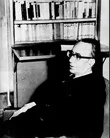 Seyyed Ahmad Fardid (Persian: سید احمد فردید) (Born in 1910,[1] Yazd – 16 August 1994, Tehran), born Ahmad Mahini Yazdi,[2] was a prominent Iranian philosopher and a professor of Tehran University. He is considered to be among the philosophical ideologues of the Islamic government of Iran which came to power in 1979. Fardid was under the influence of Martin Heidegger, the influential German philosopher, whom he considered "the only Western philosopher who understood the world and the only philosopher whose insights were congruent with the principles of the Islamic Republic. These two figures, Khomeini and Heidegger, helped Fardid argue his position."[3] What he decried was the anthropocentrism and rationalism brought by classical Greece, replacing the authority of God and faith with human reason, and in that regard he also criticized Islamic philosophers like al-Farabi and Mulla Sadra for having absorbed Greek philosophy.[4]