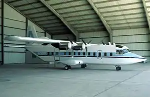 The Ahrens AR 404 was a prototype American civil transport aircraft first flown in 1976, a high-wing monoplane powered by four turboprop engines. In order to facilitate the loading and unloading of cargo, the fuselage was of constant rectangular section along almost its entire length, the main undercarriage was retracted into sponsons on the fuselage sides, and the tail included a loading ramp. As a regional airliner, the AR 404 was designed to carry 30 passengers, or in its cargo configuration, to accommodate four standard D3 freight containers.
