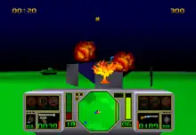 The main objective of the game is to obliterate E.B.N.E.R.S. by destroying key targets in an area such as bases, complexes, and installations, which are identified before the start of each mission at the briefing screen.[1][2][3] Every primary target must be eliminated before exiting the area via a teleportation gate and proceeding into the next area.[2] The player also fights against enemies and bosses in order to progress further. There are 32 missions in total, each one taking place across various locations.[1][2] Though primarily played in a first-person view, the player can change between multiple camera angles by pressing the assigned button on the controller's keypad to view their surroundings.[2] Although the player can explore at their own pace, a red line is put into the edge of the area to limit exploration beyond the main playfield. At the beginning, the player starts off with a cannon and shotgun as main weapons, which are interchangeable with other weapons obtained by destroying enemies scattered on the playfield and attach them either to the left or right of their aircar by pushing the corresponding buttons on the keypad.[1][2]