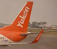 On aircraft with winglets, the outside is designed like the tail, with an orange background and the stylized "Yukon" printed on it. On the inside, "flyairnorth.com" is printed.