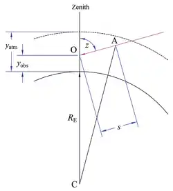 In the figure at right, an observer at O is at an elevation above sea level in a uniform radially symmetrical atmosphere of height . The path length of a light ray at zenith angle is ; is the radius of the Earth. Applying the law of cosines to triangle OAC,