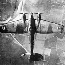 The Do 17Z was an older type of German bomber that was no longer in production by the start of the Battle. Still, many Kampfgeschwadern still operated the Dornier, known as "the flying pencil" due to its sleek fuselage. Its air-cooled radial BMW engines meant that many of these aircraft were able to survive fighter attack because there was no vulnerable cooling system to disable.[70] The Dornier was also manoeuvrable, and as a result was popular in the Luftwaffe. The main problem with the Dornier was its limited 200 mile combat range, when fully loaded with bombs. Its bomb carrying capacity was also limited to 2,205 lbs.[71] Older versions of the Do 17, mainly the E-1, were still used for weather reconnaissance duties.