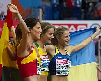 2017 European Indoor Championships podium (R.Beitia, A.Palšytė, Y. Levchenko)
