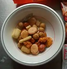 Ajigonomi is a blend of Japanese arare produced by the Bourbon food company. It consists of various kinds of rice crackers and peanut based items together with tiny dried fish.