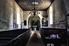 Among the furnishings, the altar is unusual in that while it is from the 17th century, the crucifix in the middle is a re-used medieval cross, from the 15th century. The baptismal font is from the 13th century.[1] Of later date is a chandelier, donated in 1850 by a carpenter as a votive gift, "in thanks to divine providence, that kept him safe during fourteen years abroad". The smaller of the two church bells was donated in 1993.[2]