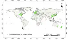 Akebia quinata is native to China, Japan and the Korean peninsula,[21] but is cultivated globally. This map represents sightings of both wild and cultivated plants.