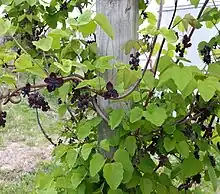 Akebia trifoliata is a climbing vine with leaves composed of three ovate, slightly lobed leaflets, often bronze-tinted when young. It grows up to 9.1 m (30 ft) long.[2] in mild winters loses its leaves in cold climates, but the twining woody branches are handsome even when bare. Flowers are deep purple in short racemes and followed by light purple fruits.[3]