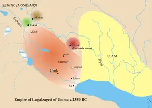 Akkad before expansion (in green). The territory of Sumer under its last king Lugal-Zage-Si appears in orange. Circa 2350 BC