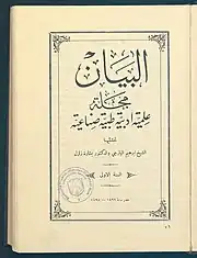 The Arabic periodical al-Bayān (English: "announcement" or "declaration") was published once or twice a month from 1 March 1897 until 16 August 1898. It was edited in Cairo by Ibrahīm Al-Yāziǧī (1847–1906)[1] and Bišāra Zalzal (1851–1905) and was the successor of the medical journal aṭ-Ṭabīb (1884–1885). Since 1898, Al-Yāziǧī, a linguist and journalist from Lebanon, particularly built up his reputation as the chief editor of the journal aḍ-Ḍiyāʾ (1898-1906).[2] Apart from scientific articles, al-Bayān focused on cultural and anthropological topics such as language and education.[3]