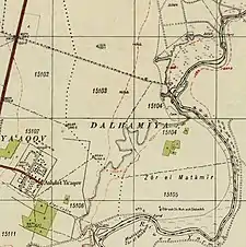 In 1875 Victor Guérin noted that the houses of the village were built of adobe, and most were surmounted by reed huts.[5] The same year C. R. Conder called it a "miserable" adobe hamlet.[6][7] A population list from about 1887 showed ed Delhamiyeh wa ’Arab el Hanady to have about 650 inhabitants; all Muslims.[8]